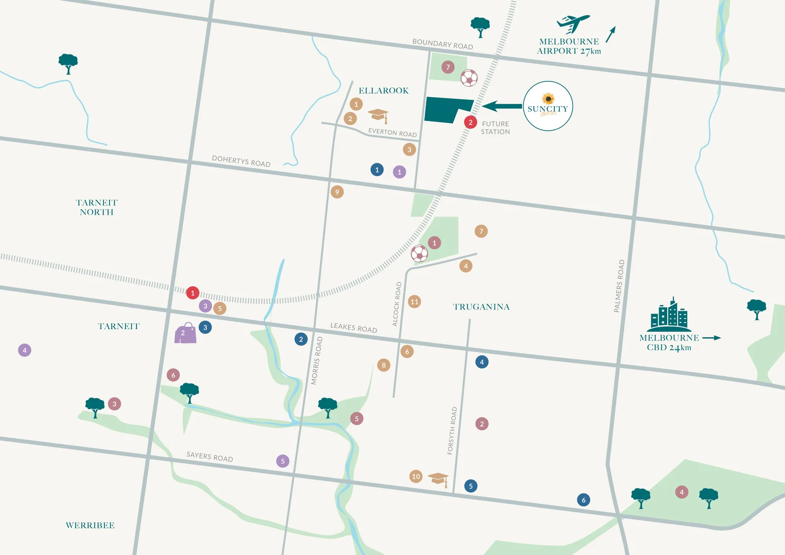 Suncity offers a vibrant lifestyle, surrounded by sports facilities, parks, quality schools, and modern amenities. A planned train station will provide seamless access to Melbourne CBD and Geelong, while nearby shopping hubs and expansive green spaces add to the convenience and appeal.